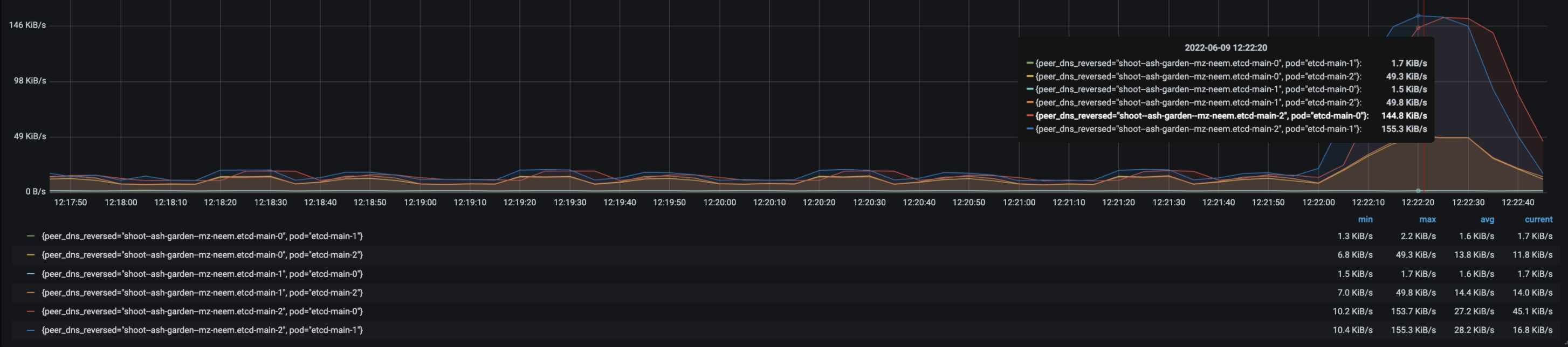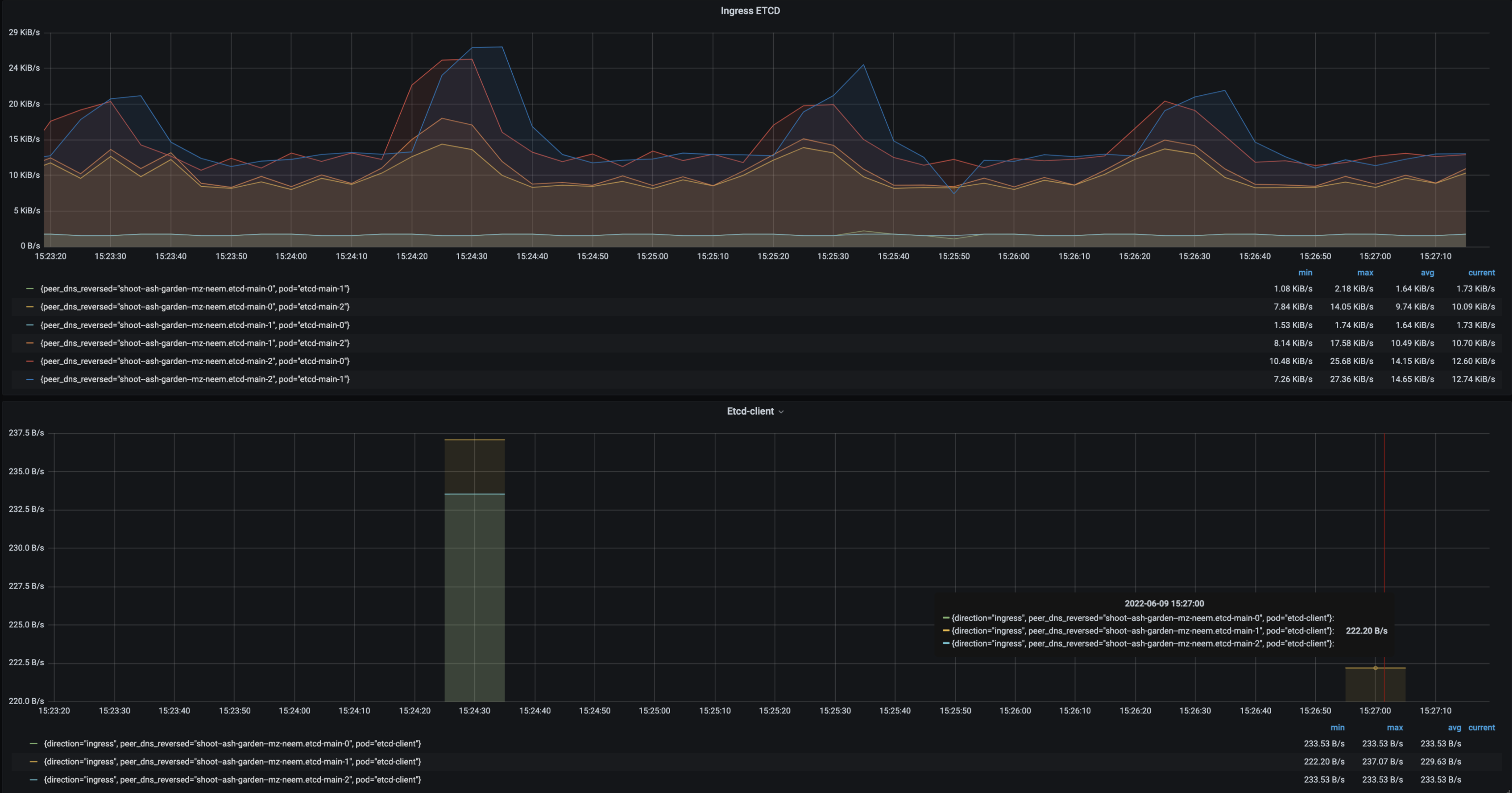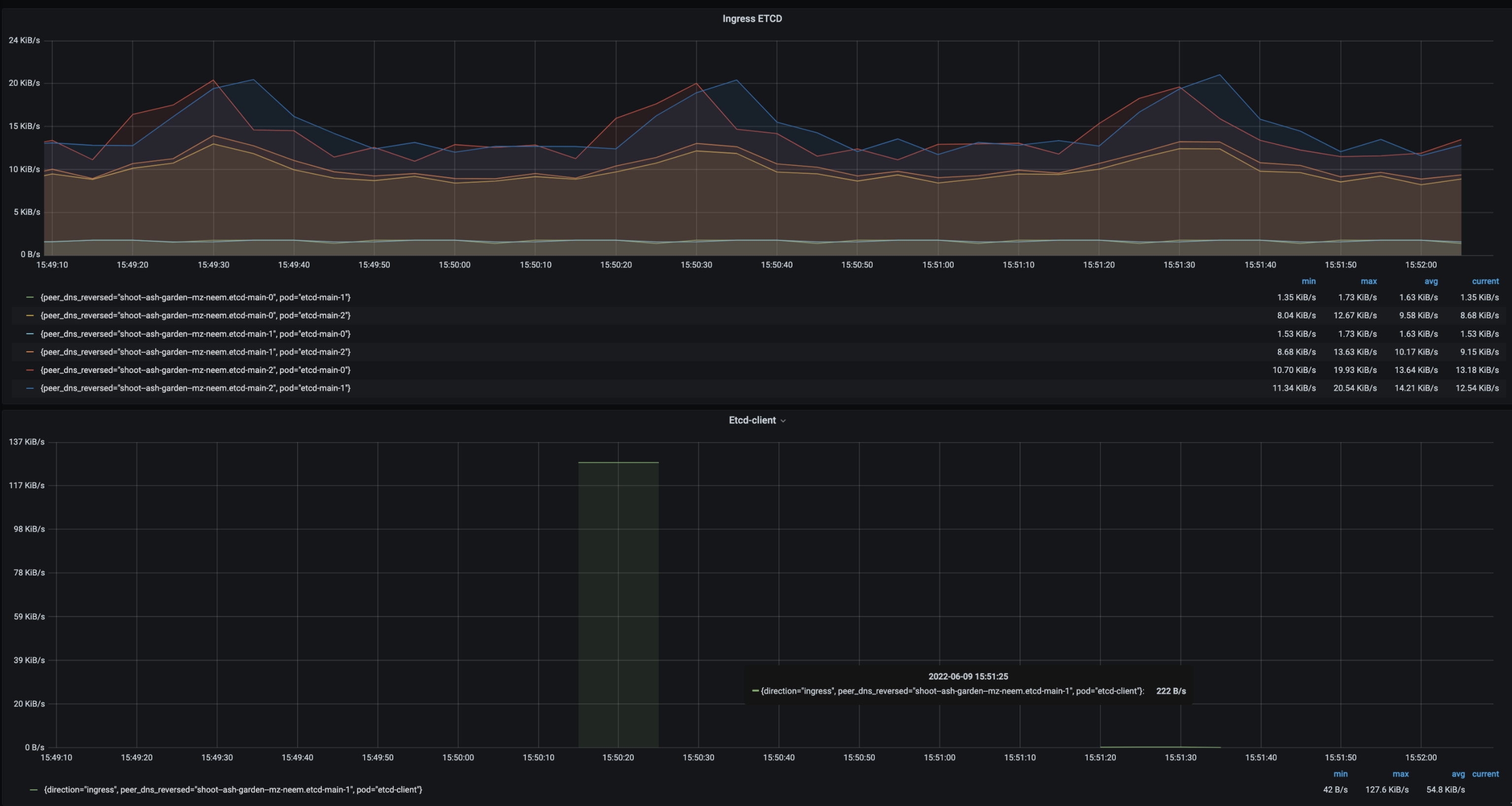 • Follower etcd-main-1 to etcd-client max egress is 222B/s.