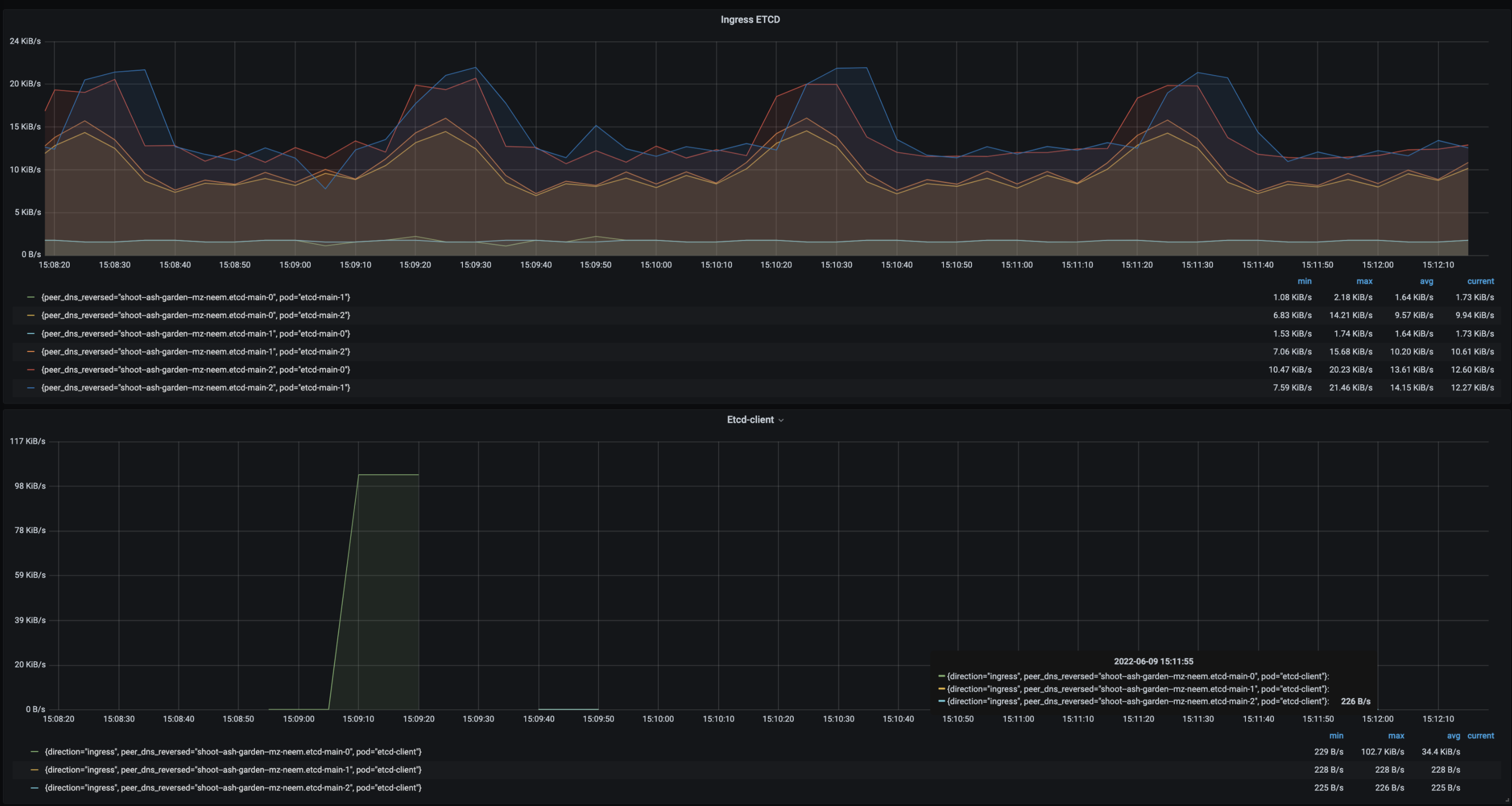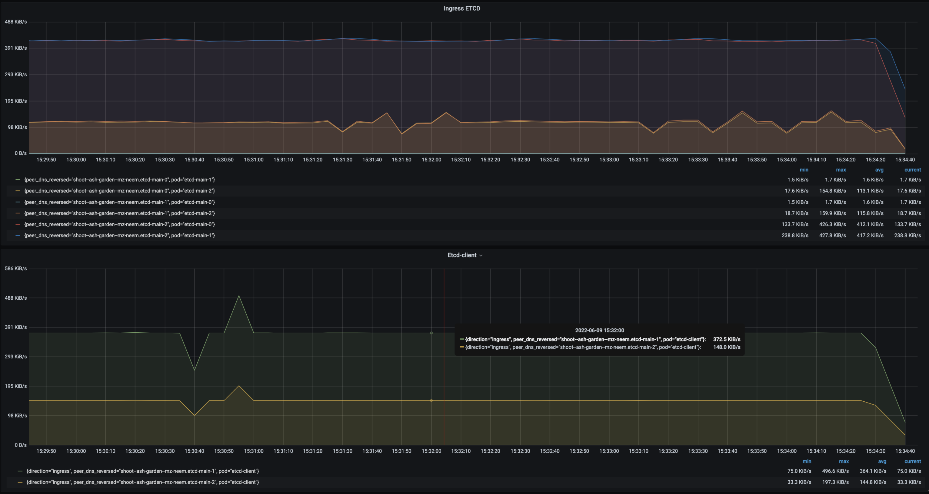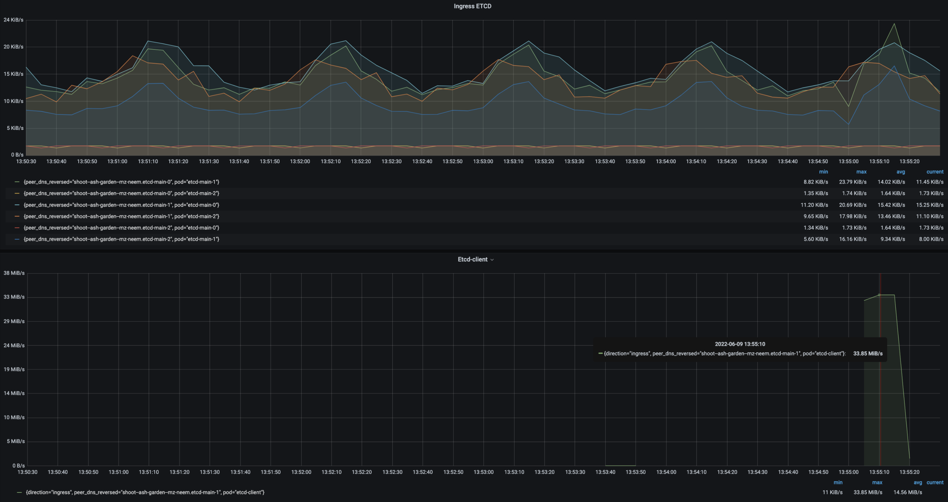 • Follower etcd-main-1 to etcd-client max egress is 496 KiBs.