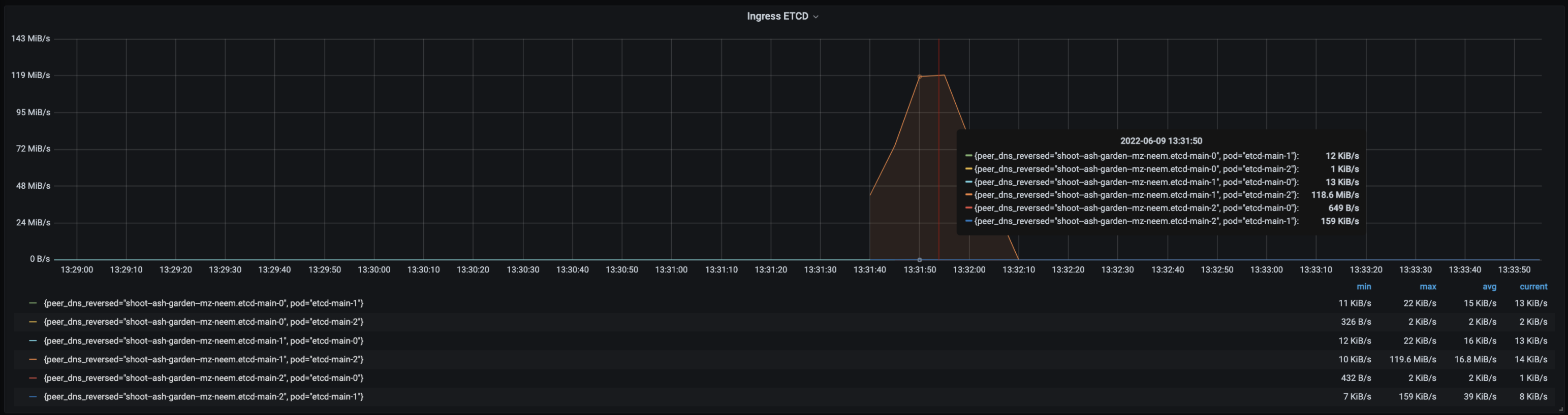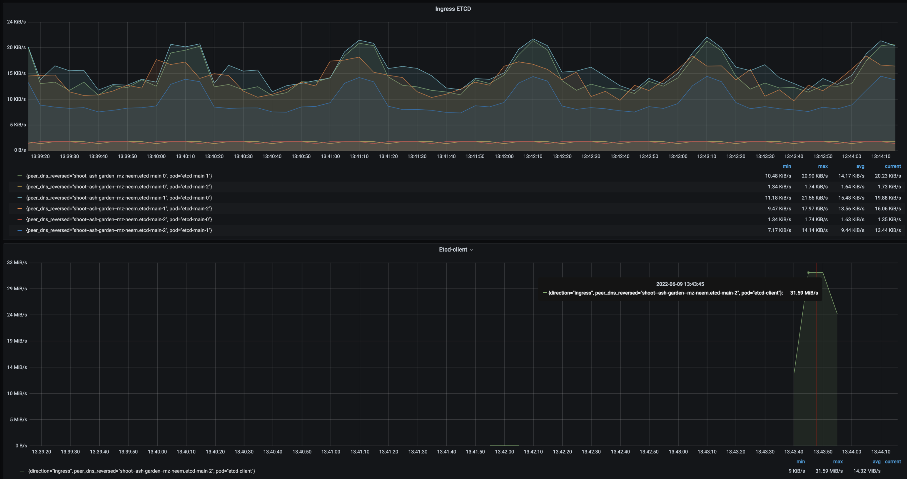 • Follower etcd-main-2 to etcd-client max egress ~32MiBs.