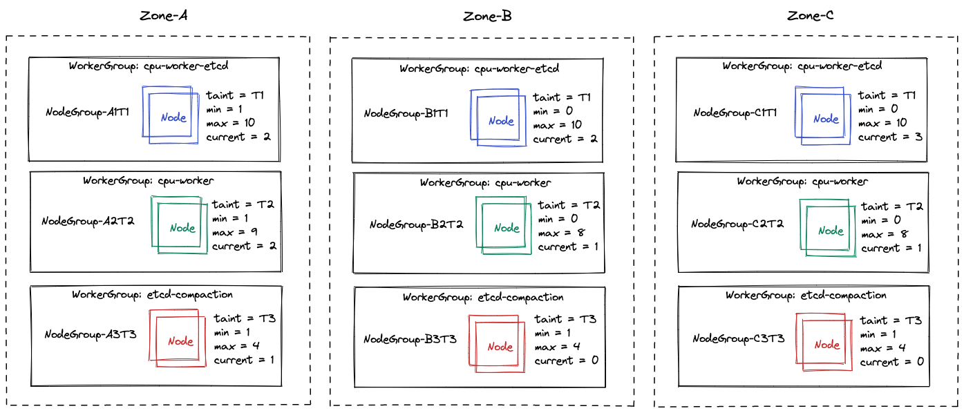 To host an HA shoot control plane within a single zone, it should be ensured that each worker pool that potentially runs seed system or shoot control plane components should have at least three nodes. This is also the minimum size that is required by an HA etcd cluster with a failure tolerance of a single node. Furthermore, the nodes must run in a single zone only (see Recommended Number of Nodes and Zones).