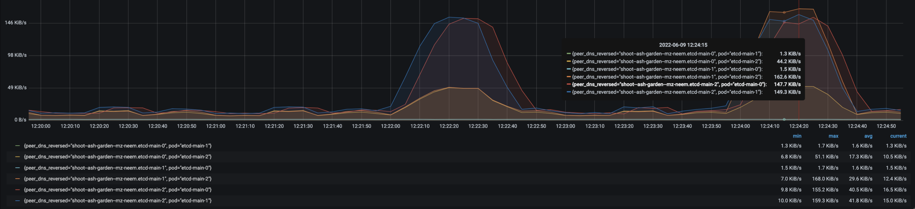 • New follower etcd-main-2 to leader max egress: ~159 KiB/s (pattern duration: 40 secs).